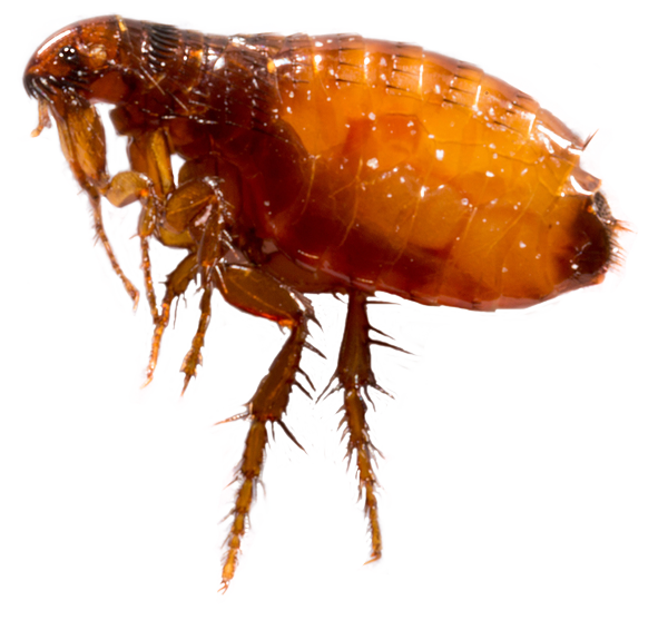 Most flea infestations are caused by the common Cat Flea. Fleas are wingless insects with legs designed to jump and measure approximately 2mm at maturity. Fleas are parasites feeding on warm blooded animals after which the female lays her eggs.